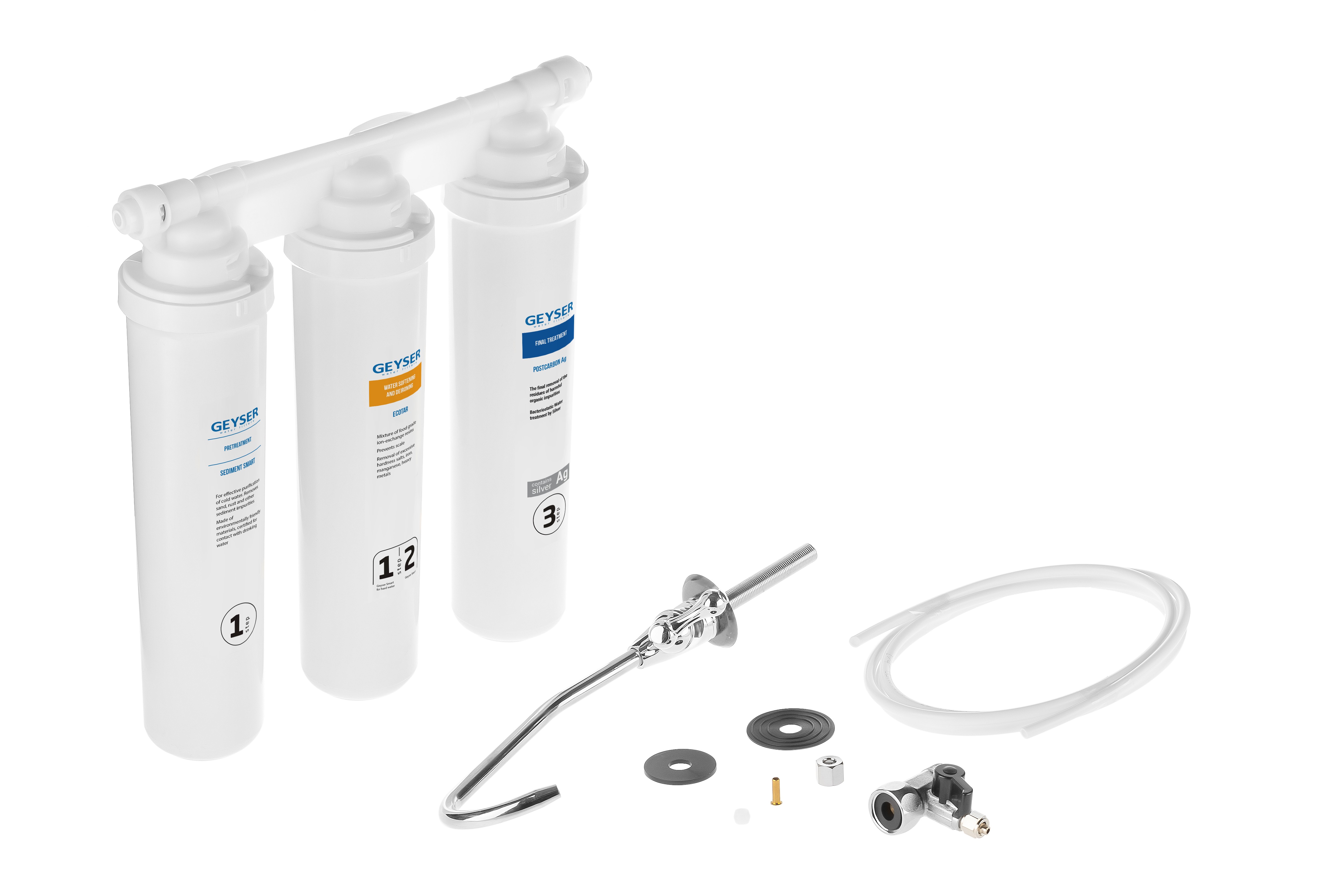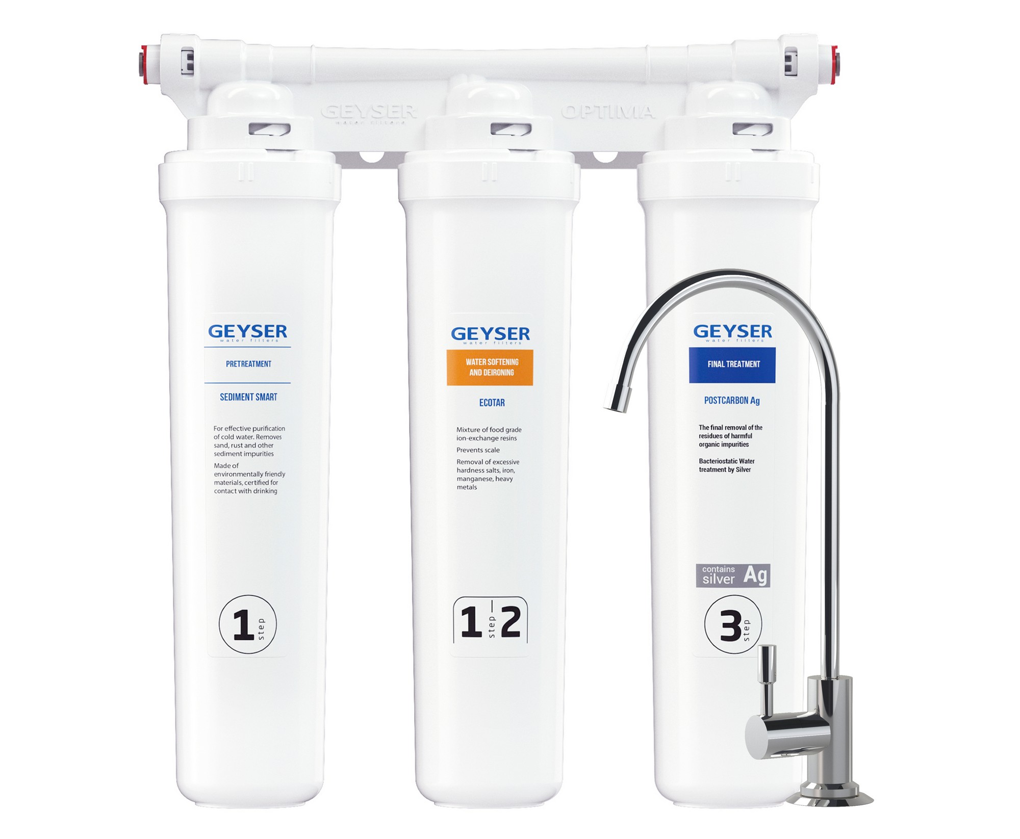 Фильтр Гейзер Оптима Старт предназначен для доочистки водопроводной воды от примесей, таких как железо, бактерии, хлорорганические и органические примеси, хлор, тяжелые металлы и механические частицы, избыток солей жесткости. Предотвращает образование накипи. Улучшает органолептические показатели воды: вкус, цвет и запах.