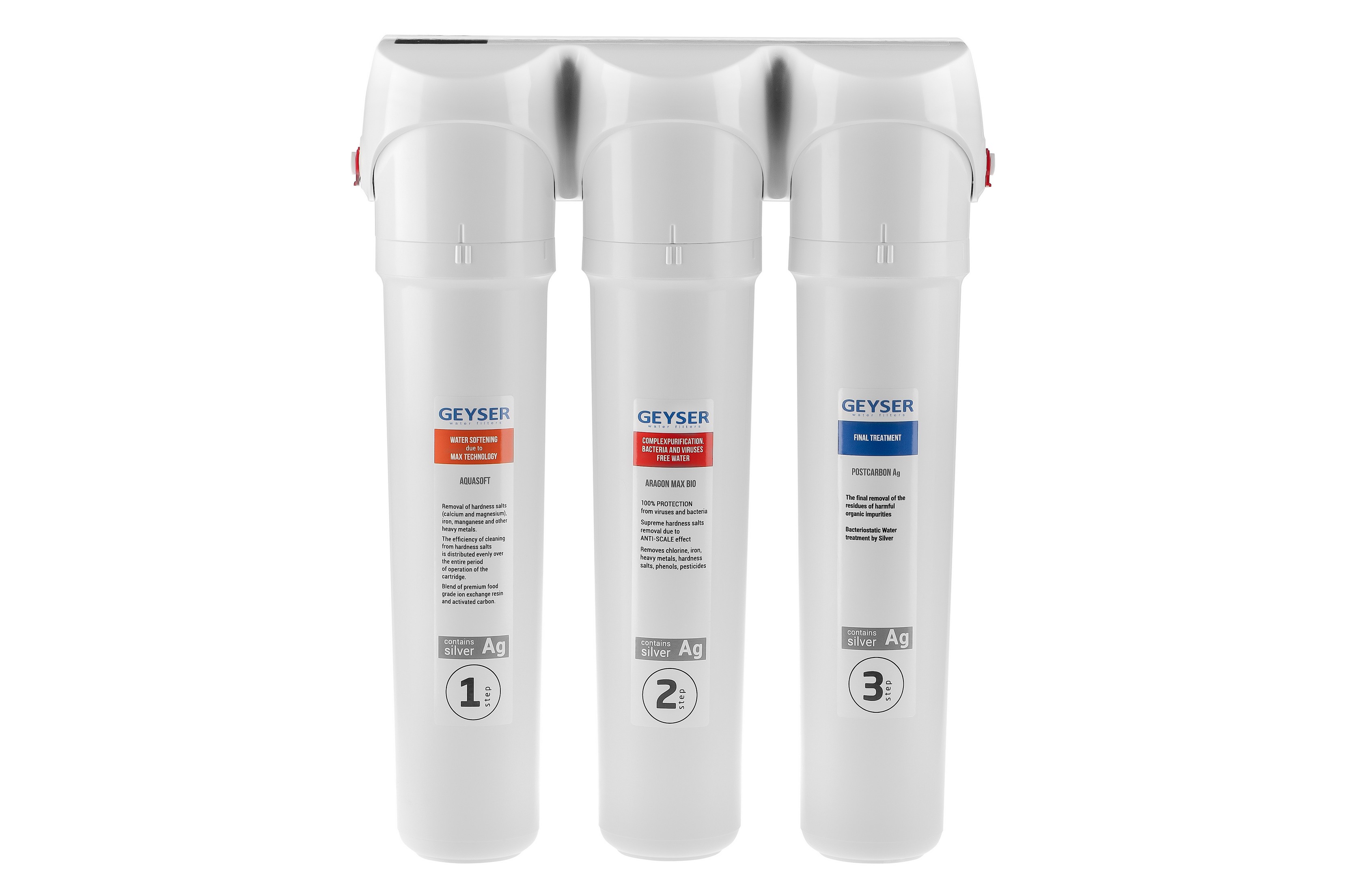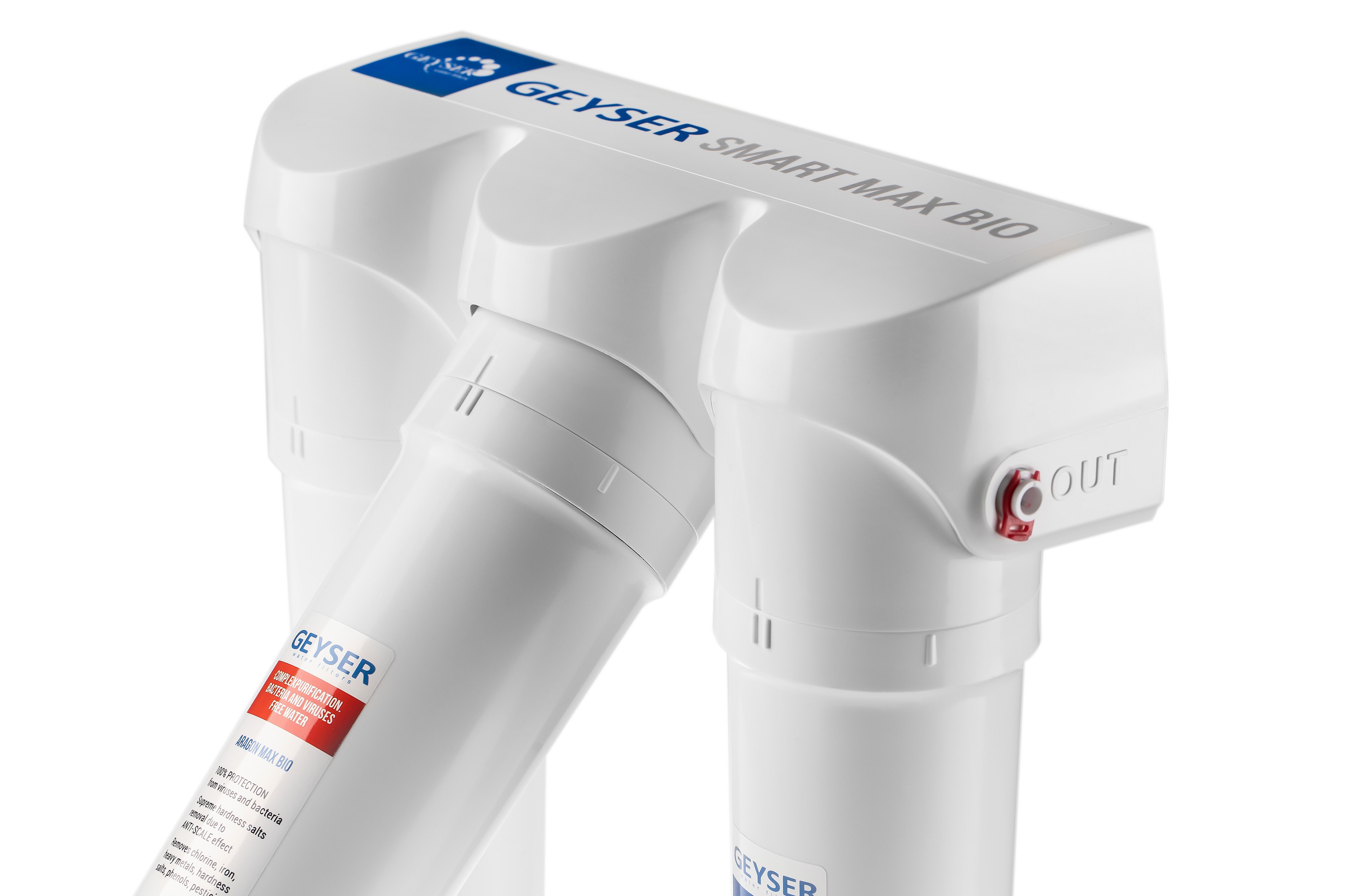 Арагон Смарт Макс Био (вторая ступень) — уникальный картридж, разработанный для очистки жесткой воды. Сочетает в себе сразу два материала: «Арагон МАКС» и «Арагон БИО», позволяет комплексно очистить воду от вредных примесей, включая вирусы и бактерии, при этом стабилизирует кислотность воды. Благодаря тому, что материал «Арагон» имеет интенсивный поверхностный заряд, происходит полное уничтожение вирусов, а за счёт минимального размера пор происходит задерживание бактерий. Активное серебро, внедрённое в состав картриджа, предотвращает их жизнедеятельность. Используется только в фильтре Гейзер Смарт Макс Био.