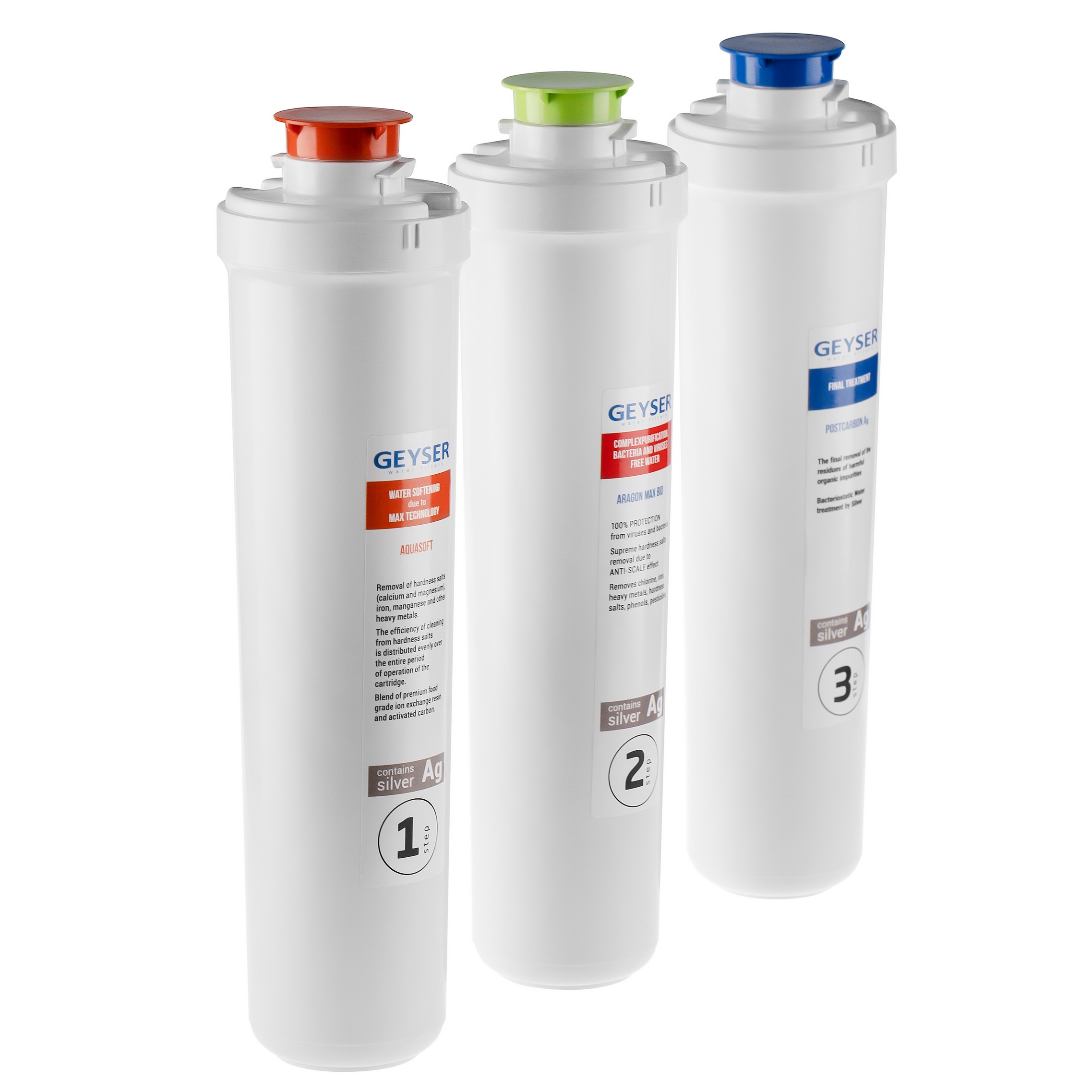 Данный комплект сменный картриджей предназначен для применения в трёхступенчатом фильтре Гейзер Смарт Макс Био.
