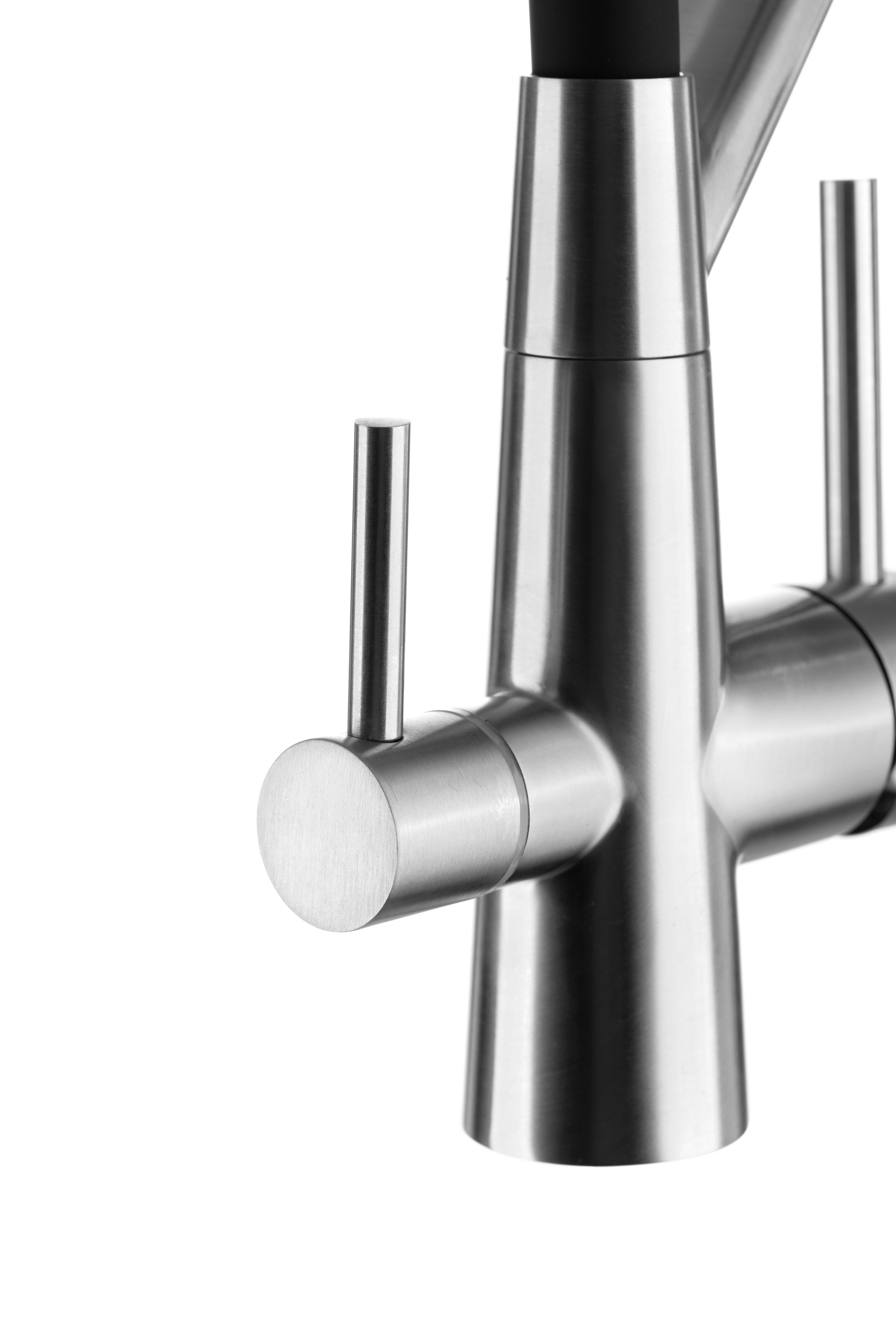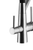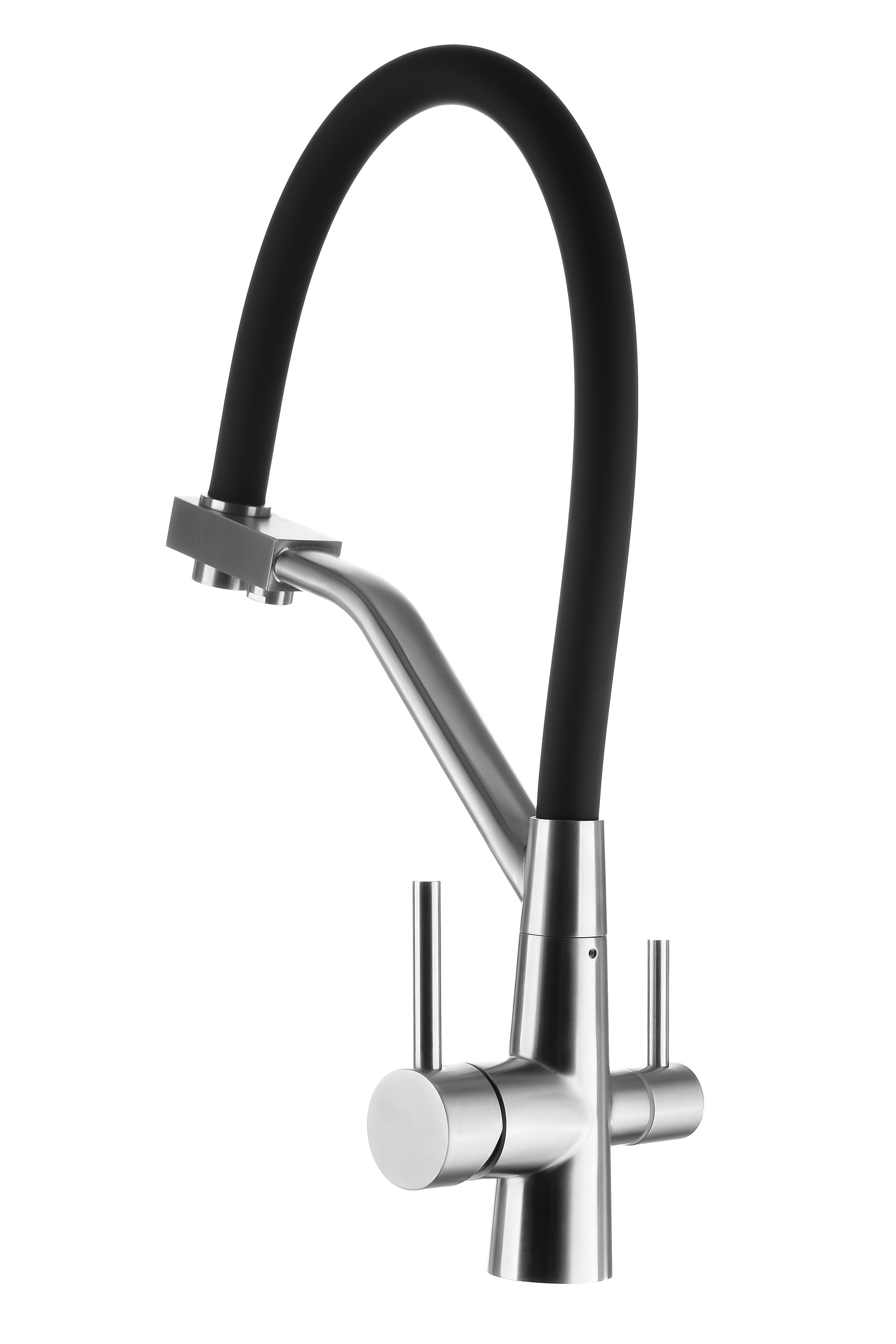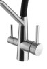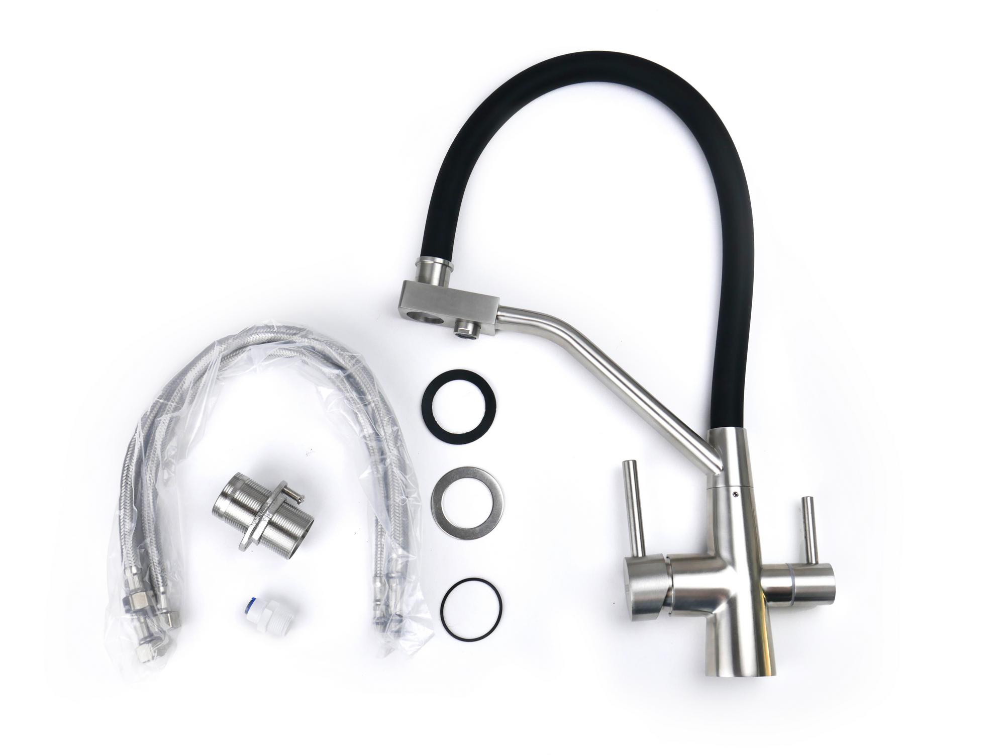 Стальной смеситель с краном для питьевой воды Ниагара дополнен гибким чёрным изливом. Очищенная питьевая вода гарантированно не смешивается с водопроводной, поскольку проходит по разным каналам. В комплекте — переходник для подключения фильтра к смесителю с 1/4"на 3/8".