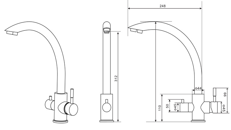 Излив с двойной функциональностью – нет необходимости сверлить дополнительное отверстие в мойке для крана питьевой воды после фильтра;